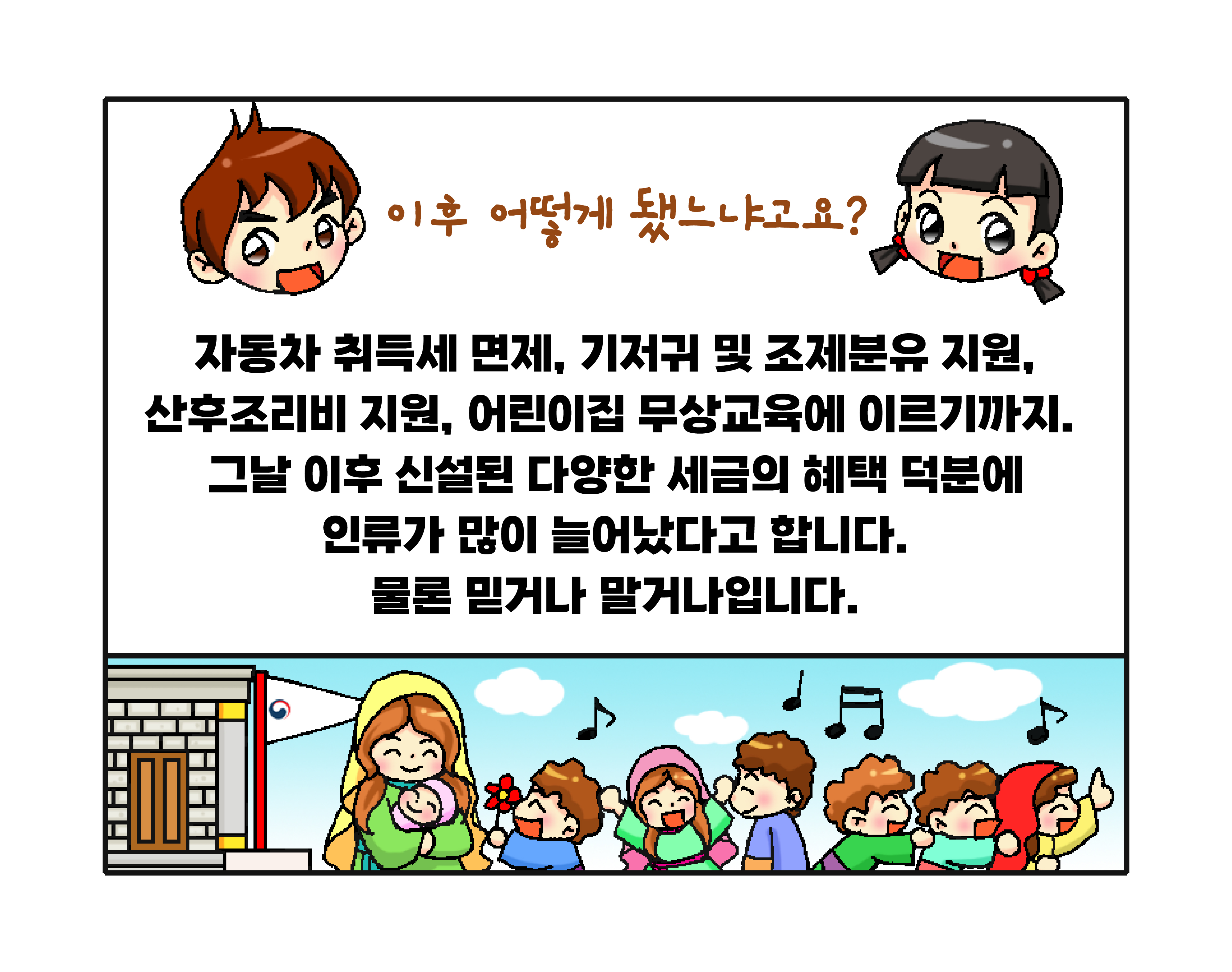 세금이 아이 낳기 좋은 세상을 만듭니다! 작성자 정보 국세청어린이신문 작성 작성일 2025.09.26 22:49 컨텐츠 정보 114 조회 목록 본문 솔로몬왕이 진짜 엄마를 밝혀낸 방법은? 관련자료 등록된 댓글이 없습니다. 로그인한 회원만 댓글 등록이 가능합니다. 목록
