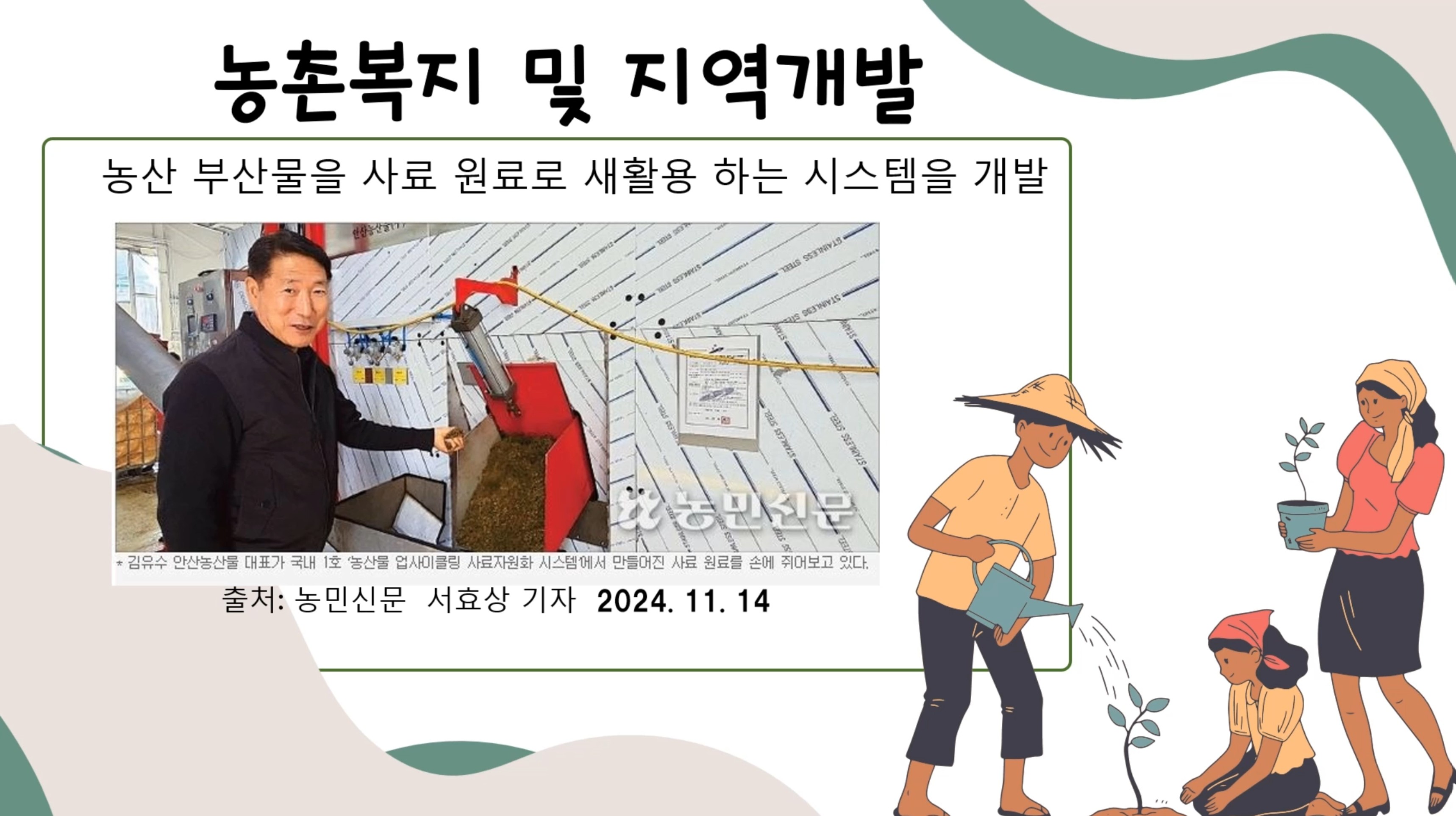 마지막으로 농촌복지 및 지역개발에도 쓰입니다. 최근 농산 부산물을 사료 원료로 업사이클(재활용) 하는 시스템을 개발했다고 합니다. 이런 시스템을 개발하는 데에도 세금이 쓰인다고 하는데요. 도시뿐만 아니라 농어촌에도 알뜰하게 쓰이는 세금에 대해 알아보았습니다.