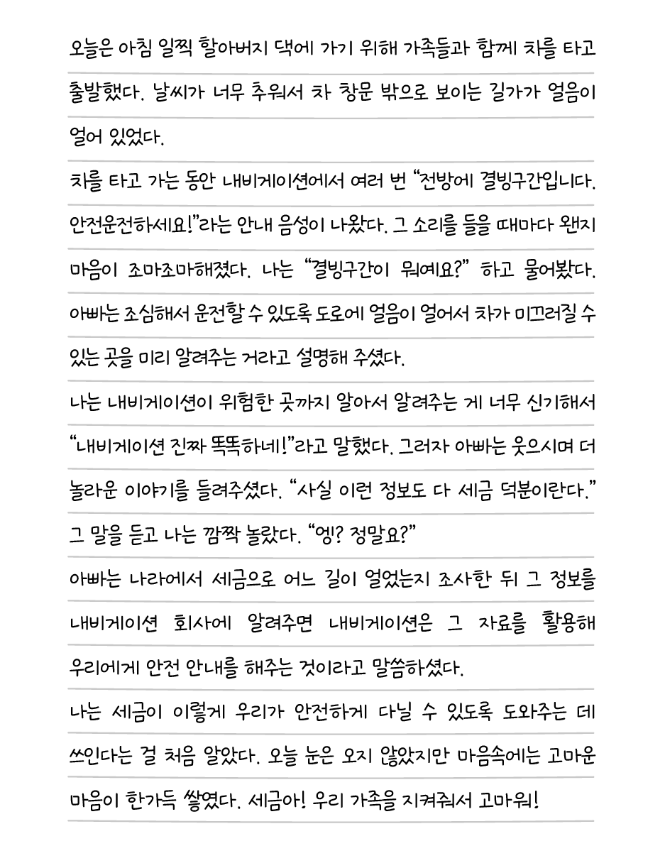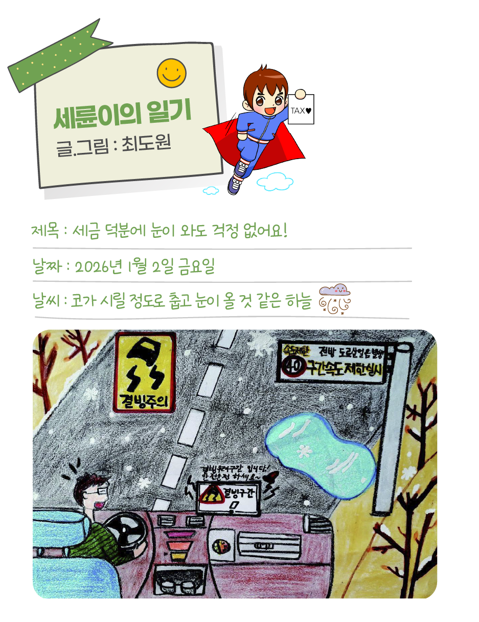 세륜이의일기 분류 세금 덕분에 눈이 와도 걱정 없어요! 작성자 정보 국세청어린이신문 작성 작성일 2026.01.02 15:50 컨텐츠 정보 37 조회 목록 본문 세륜이의일기 세금 덕분에 눈이 와도 걱정 없어요! 관련자료 목록