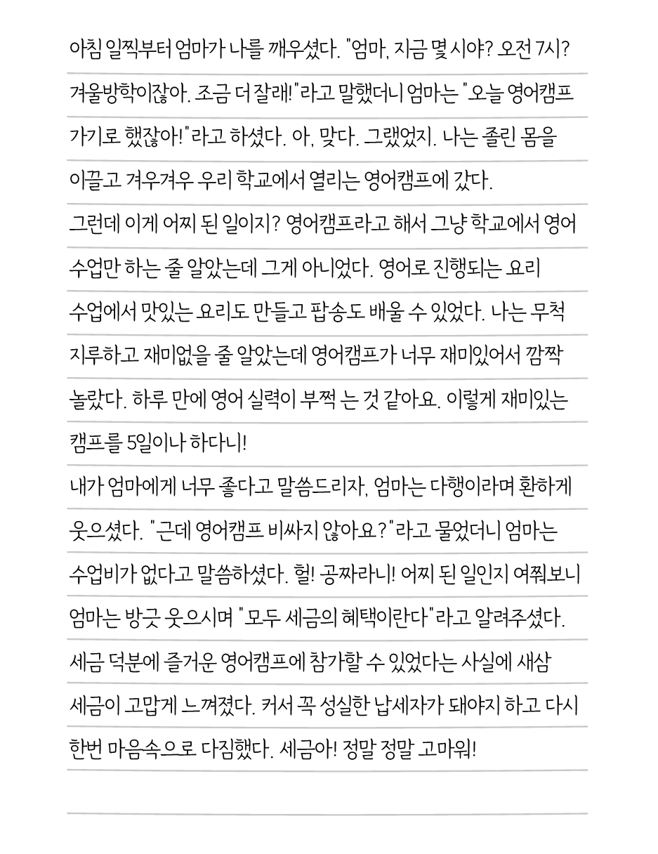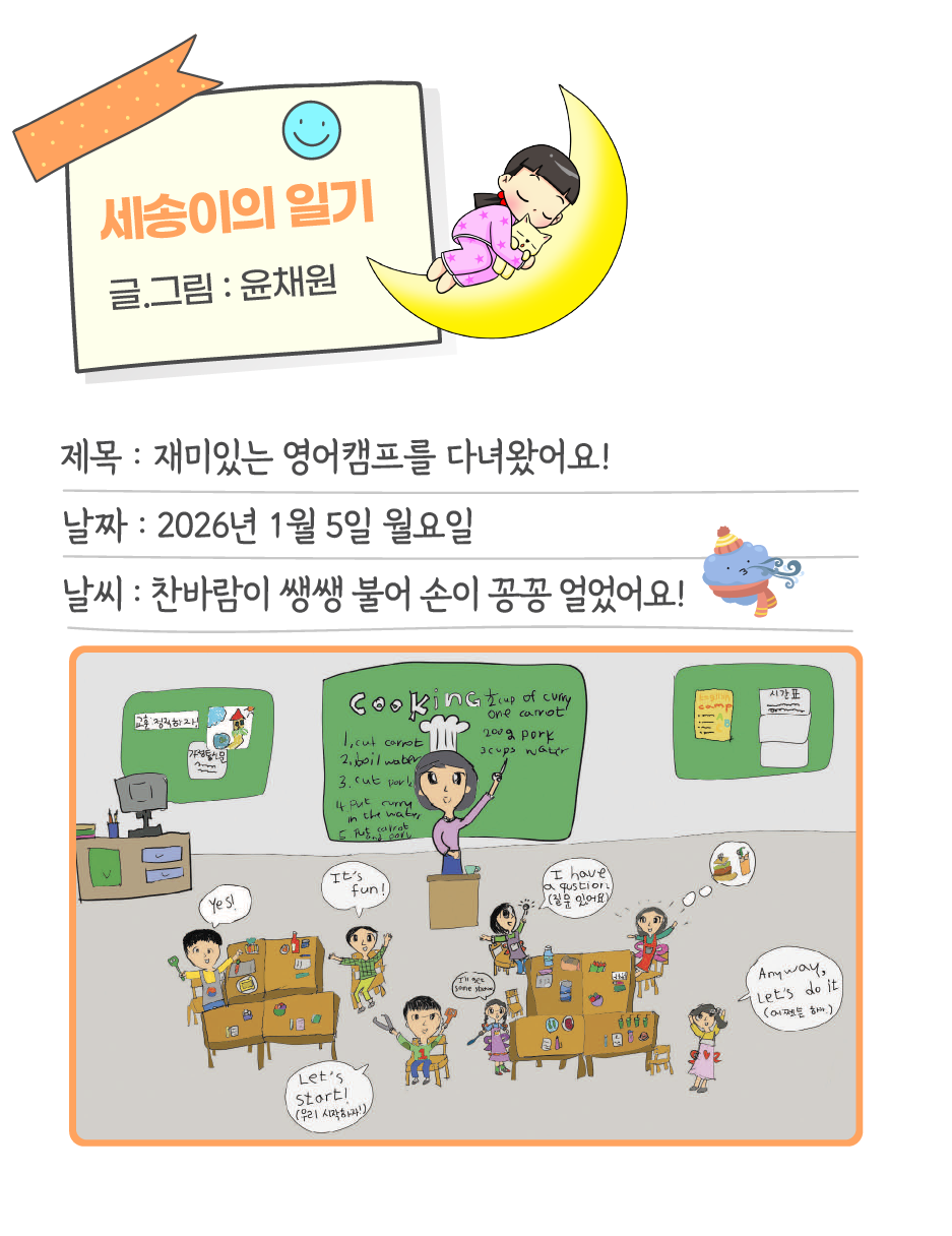 세송이의일기 분류 재미있는 영어캠프를 다녀왔어요! 작성자 정보 국세청어린이신문 작성 작성일 2026.01.08 15:20 컨텐츠 정보 22 조회 목록 본문 세송이의일기 재미있는 영어캠프를 다녀왔어요! 관련자료 목록