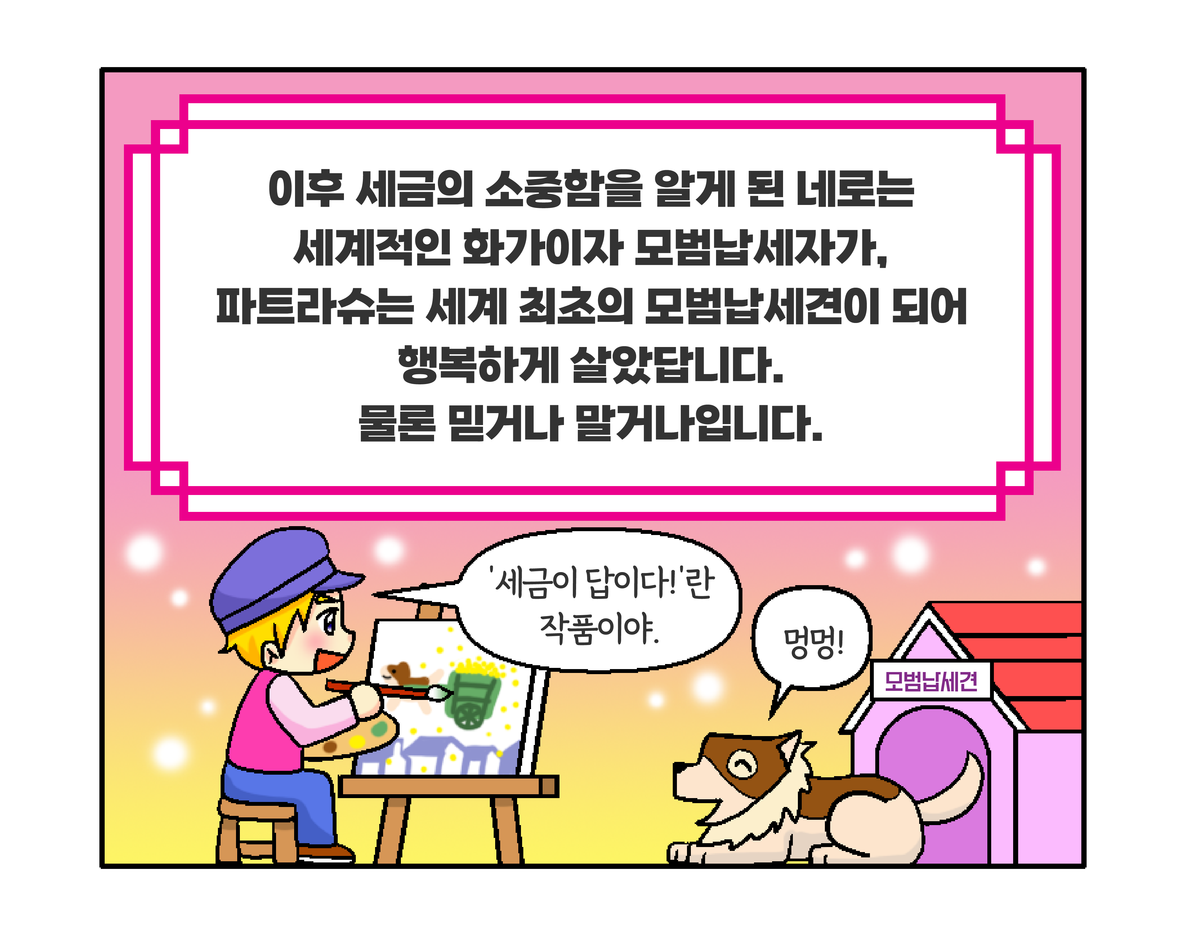 세금이 진범을 잡아줍니다! 작성자 정보 국세청어린이신문 작성 작성일 2026.03.20 22:55 컨텐츠 정보 11 조회 목록 본문 네로는 어떻게 누명을 벗게 되었을까요? 관련자료 등록된 댓글이 없습니다. 로그인한 회원만 댓글 등록이 가능합니다. 목록