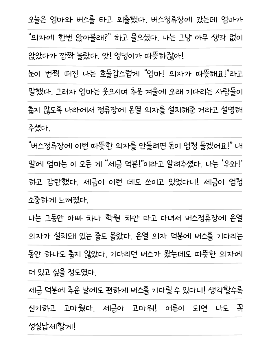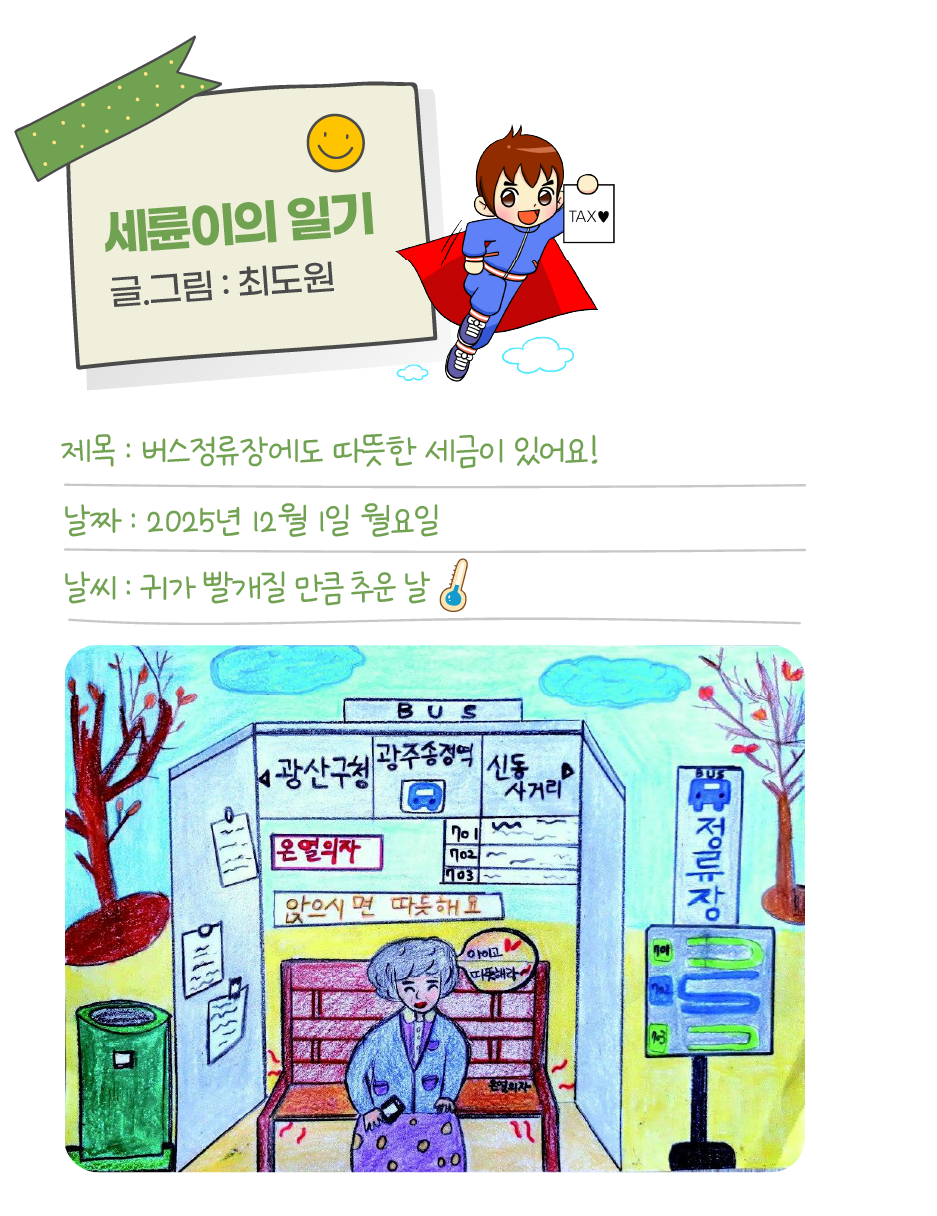 세륜이의일기 분류 버스정류장에도 따뜻한 세금이 있어요! 작성자 정보 국세청어린이신문 작성 작성일 2025.12.01 22:26 컨텐츠 정보 112 조회 목록 본문 세륜이의일기 버스정류장에도 따뜻한 세금이 있어요! 관련자료 목록