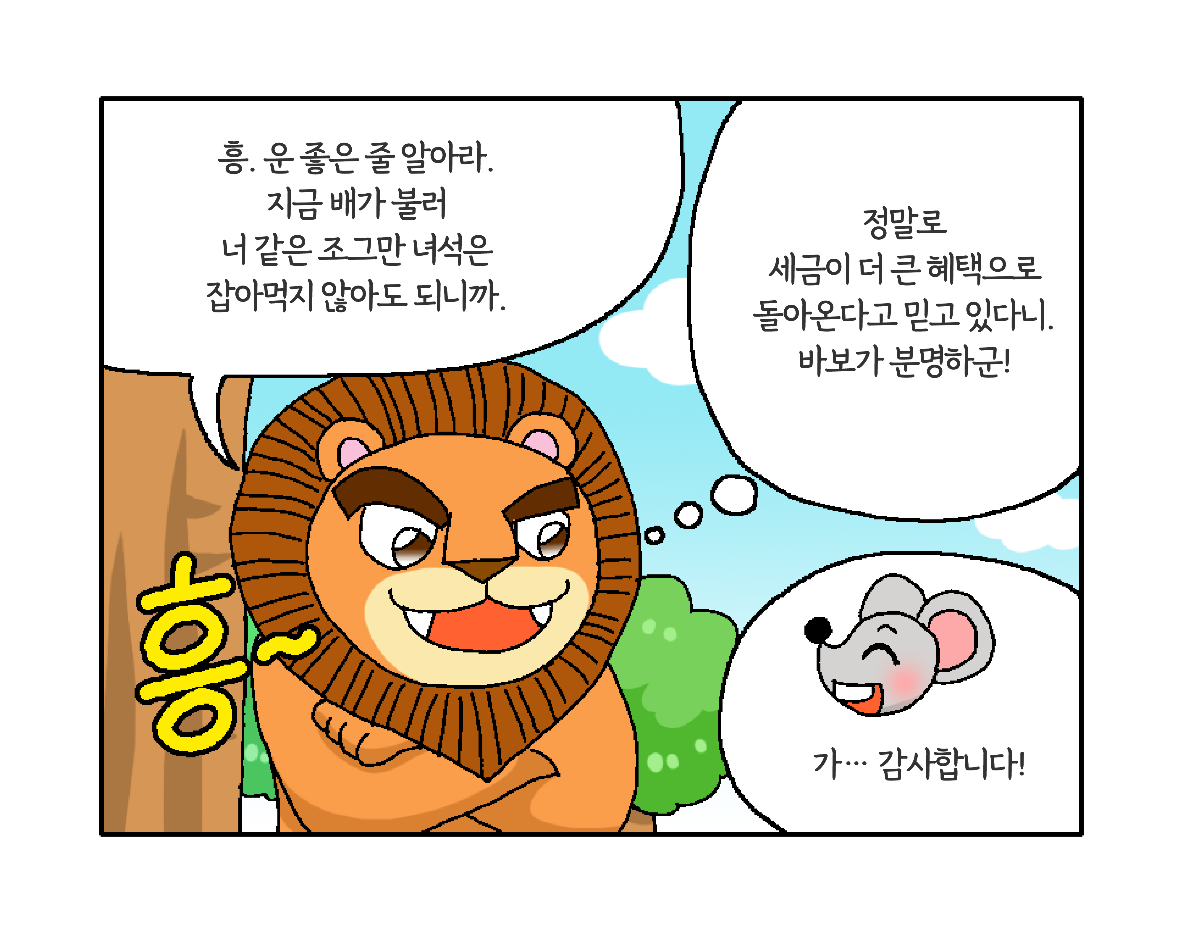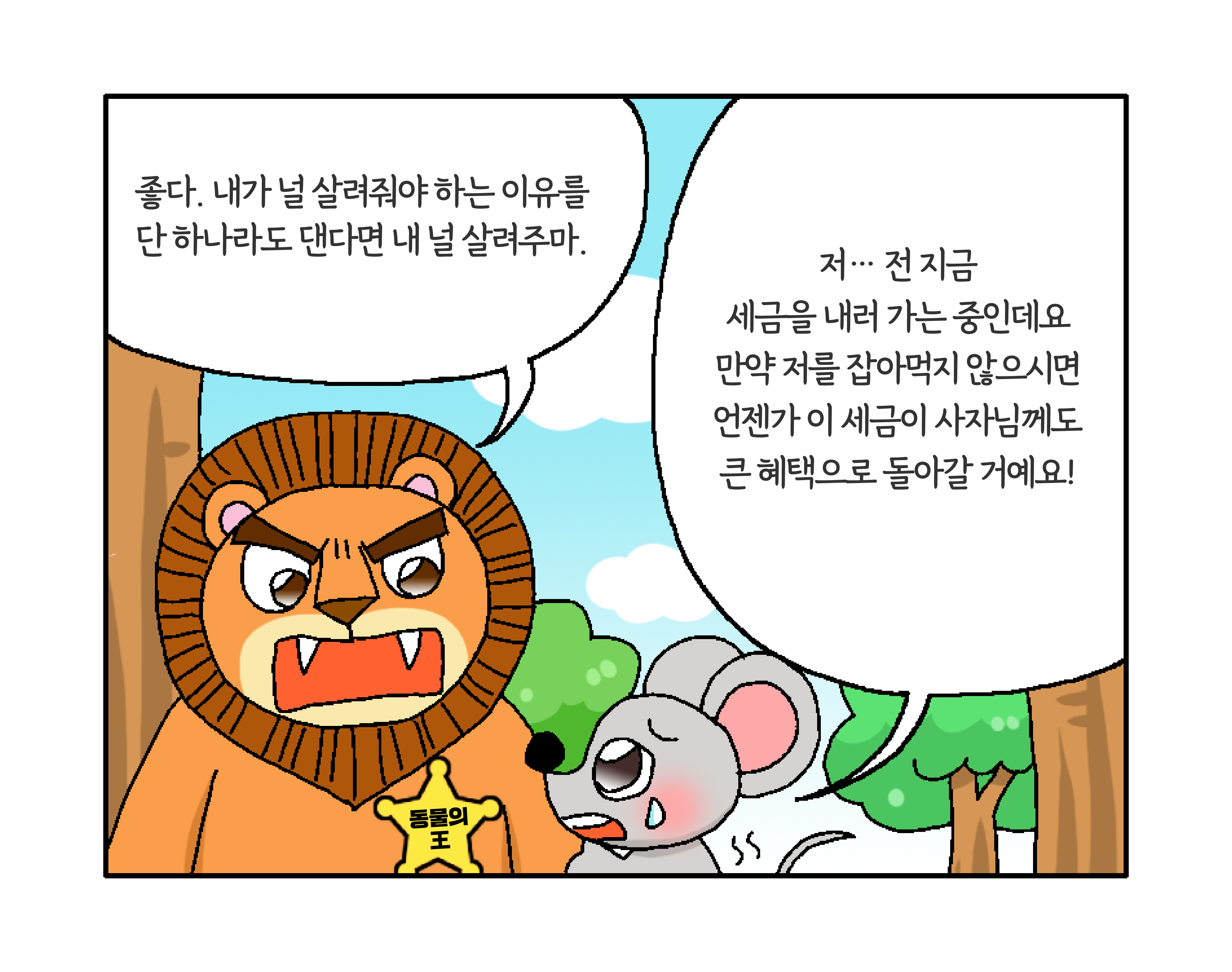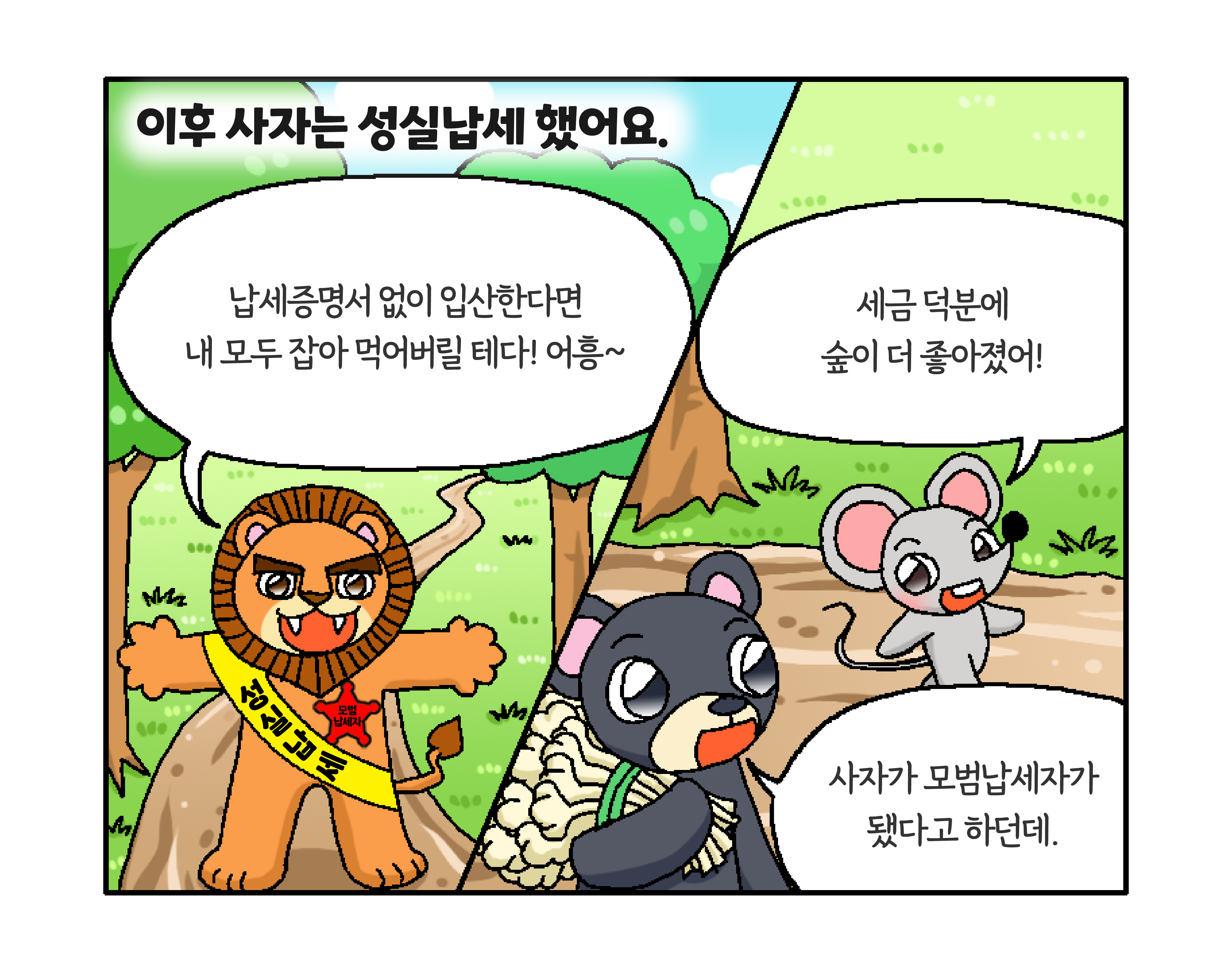 세금이 숲과 동물 친구들을 지켜줍니다! 작성자 정보 국세청어린이신문 작성 작성일 2026.01.27 11:34 컨텐츠 정보 134 조회 목록 본문 생쥐가 사자를 구할 수 있었던 비결은? 관련자료 등록된 댓글이 없습니다. 로그인한 회원만 댓글 등록이 가능합니다. 목록