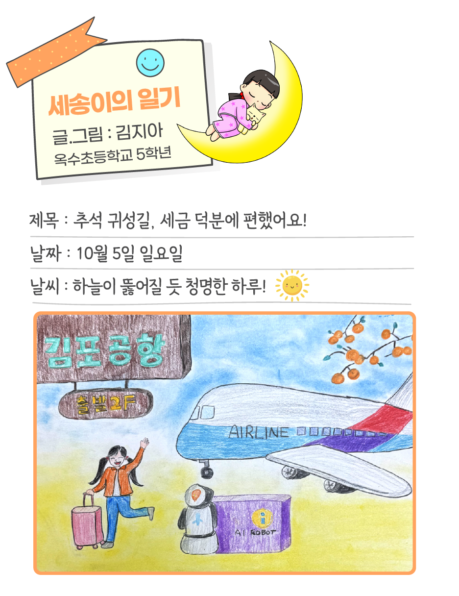 세송이의일기 분류 추석 귀성길, 세금 덕분에 편했어요! 작성자 정보 국세청어린이신문 작성 작성일 2025.10.10 14:33 컨텐츠 정보 15 조회 목록 본문 세송이의일기 추석 귀성길, 세금 덕분에 편했어요! 관련자료 목록