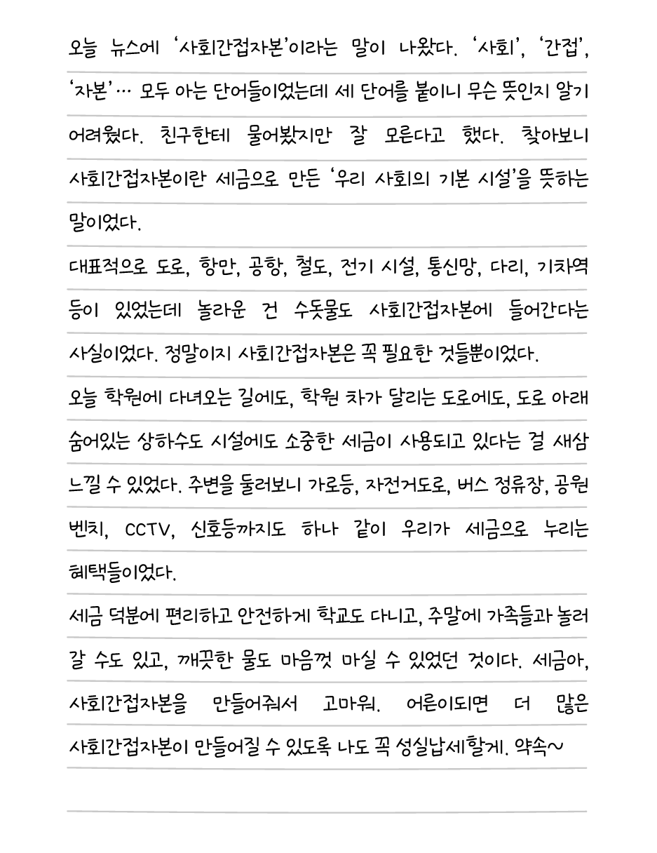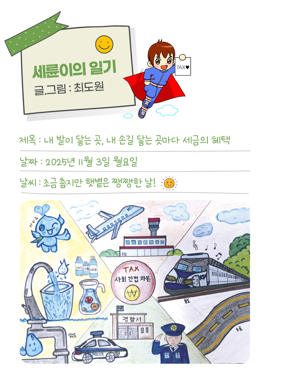 세륜이의일기 분류 내 발이 닿는 곳, 내 손길 닿는 곳마다 세금의 혜택 작성자 정보 국세청어린이신문 작성 작성일 2025.11.03 15:12 컨텐츠 정보 40 조회 목록 본문 세륜이의일기 내 발이 닿는 곳, 내 손길 닿는 곳마다 세금의 혜택 관련자료 목록