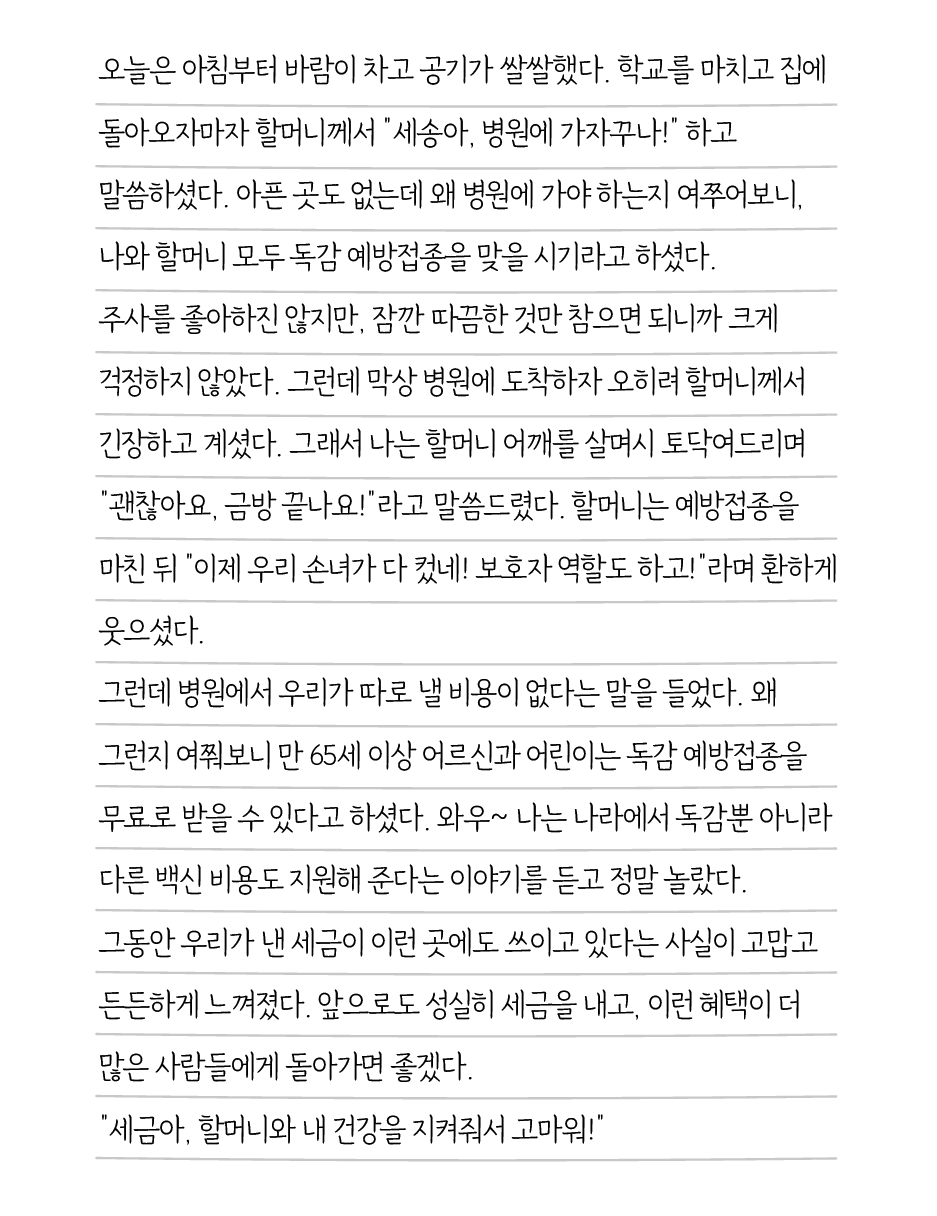 세송이의일기 분류 우리 가족의 건강을 지켜주는 든든한 세금 작성자 정보 국세청어린이신문 작성 작성일 2025.11.05 22:39 컨텐츠 정보 30 조회 목록 본문 세송이의일기 우리 가족의 건강을 지켜주는 든든한 세금 관련자료 목록