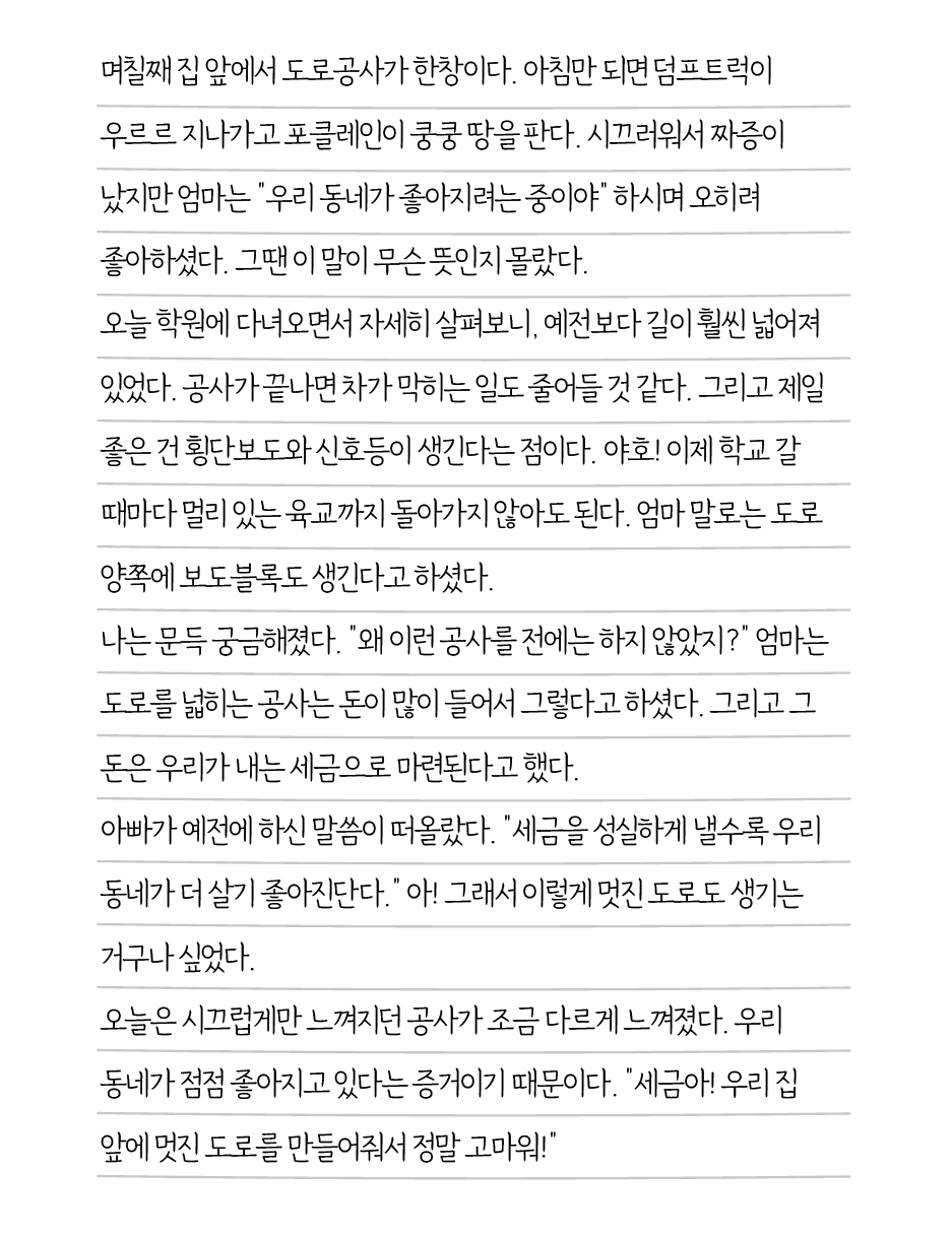 세송이의일기 분류 세금 덕분에 우리 집 앞 도로가 넓어졌어요! 작성자 정보 국세청어린이신문 작성 작성일 2026.04.07 00:11 컨텐츠 정보 5 조회 목록 본문 세송이의일기 세금 덕분에 우리 집 앞 도로가 넓어졌어요! 관련자료 목록